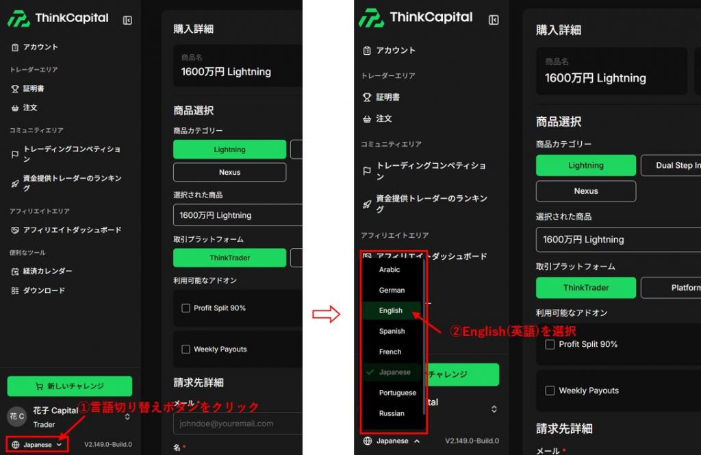 会員ページ(ダッシュボード)にログイン、表示言語を英語に切り替えます。