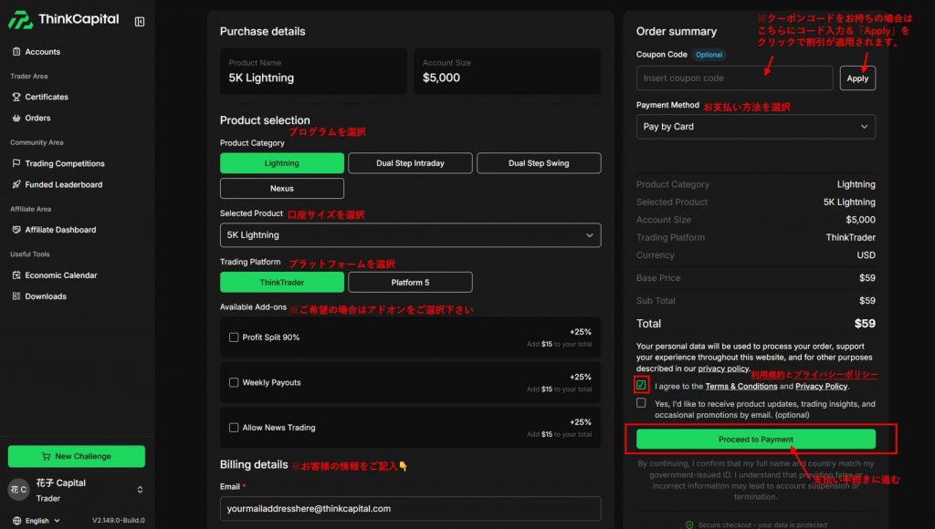 プログラム(チャレンジ口座)をご購入の際に、基軸通貨を日本円(JPY)または米ドル(USD)からお選びいただけます。なお、日本語サイト(およびダッシュボード)のチャレンジ購入ページでは、日本円(JPY)建て口座がデフォルトで表示されます。