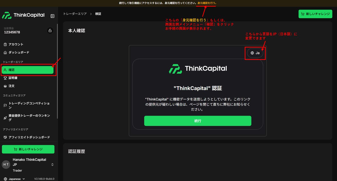 ※「確認」および「身元確認を行う」がダッシュボード上に表示されない場合はサポート([email protected])までお問い合わせください。