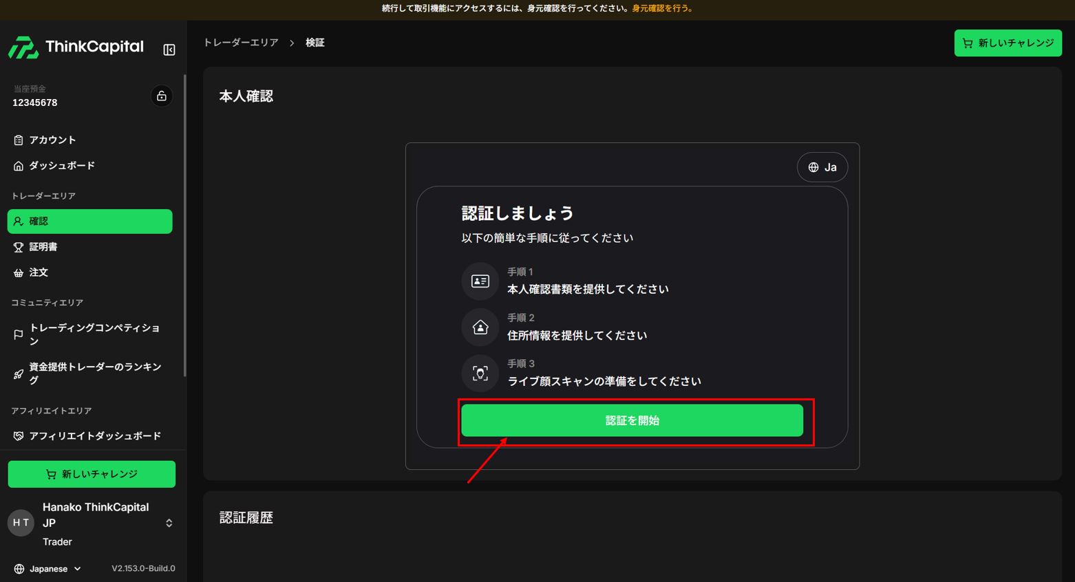 「認証を開始」をクリックすると、以下のページが表示されます。