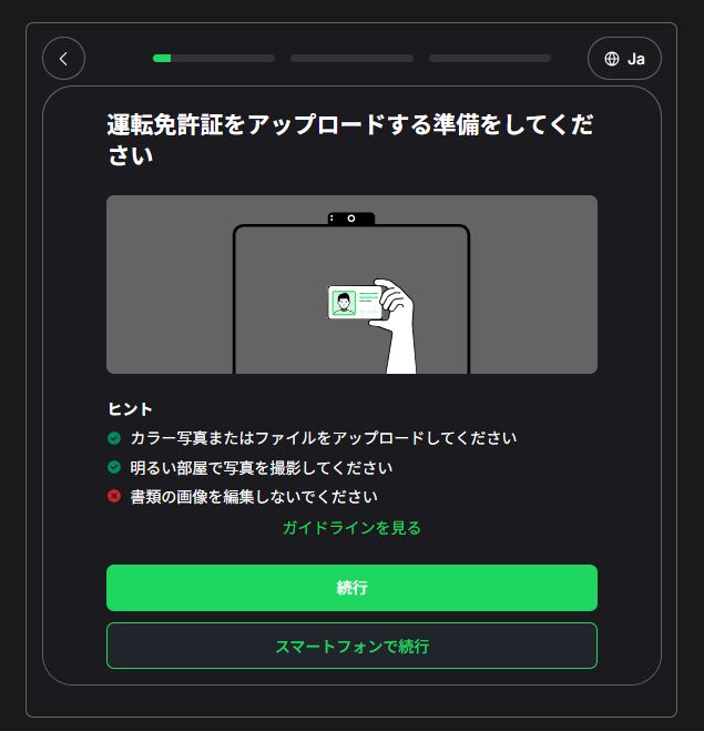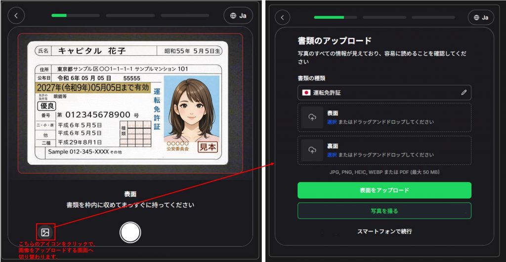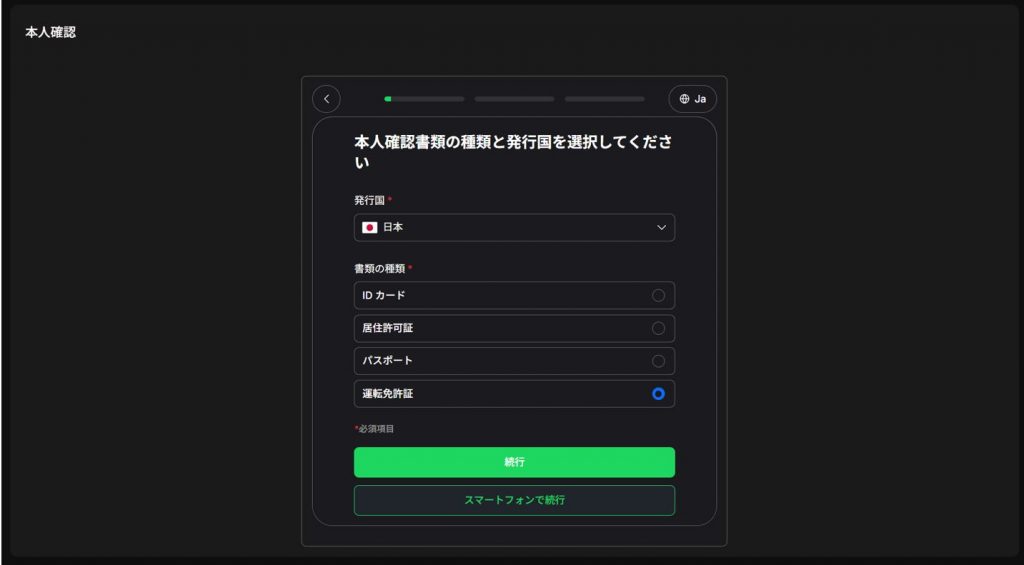 はじめに本人確認書類の提出を行いますが、書類の提出はデスクトップ(PC)およびスマートフォンのいずれのデバイスからでも行うことが可能です。