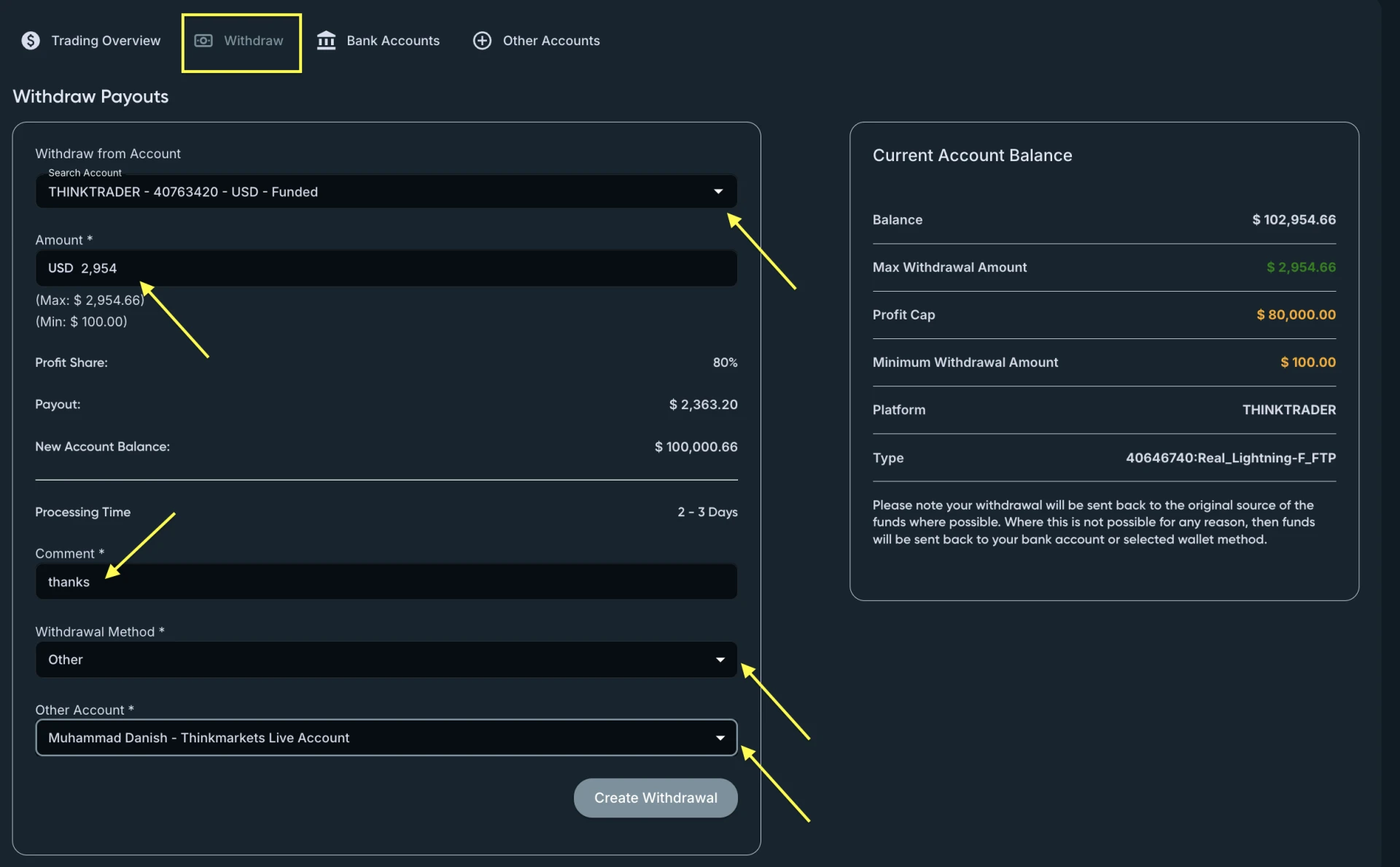 Finally, select your newly added ThinkMarkets Live Account from the Other Account dropdown and click Create Withdrawal.