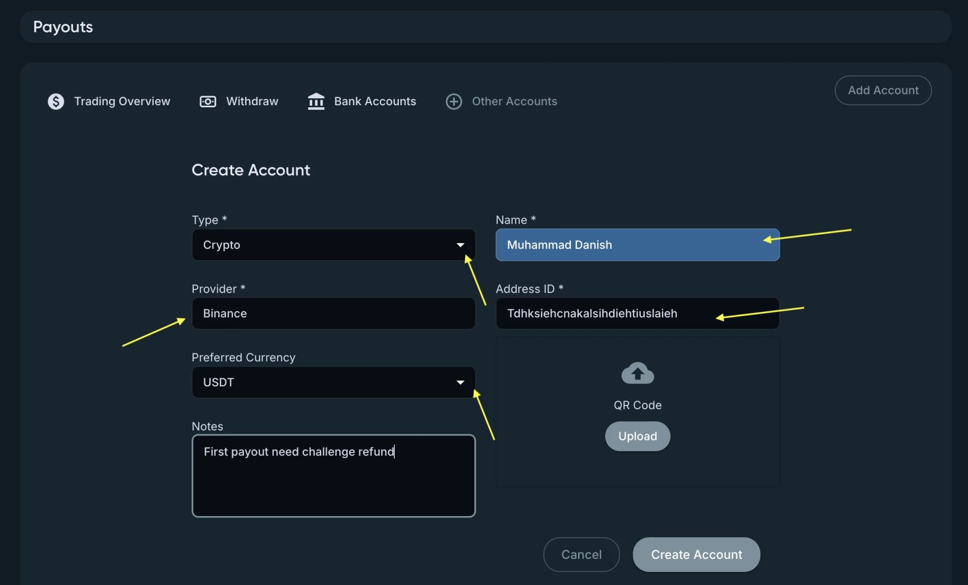 填写您的钱包详细信息(请参考附件截图)并点击创建账户。