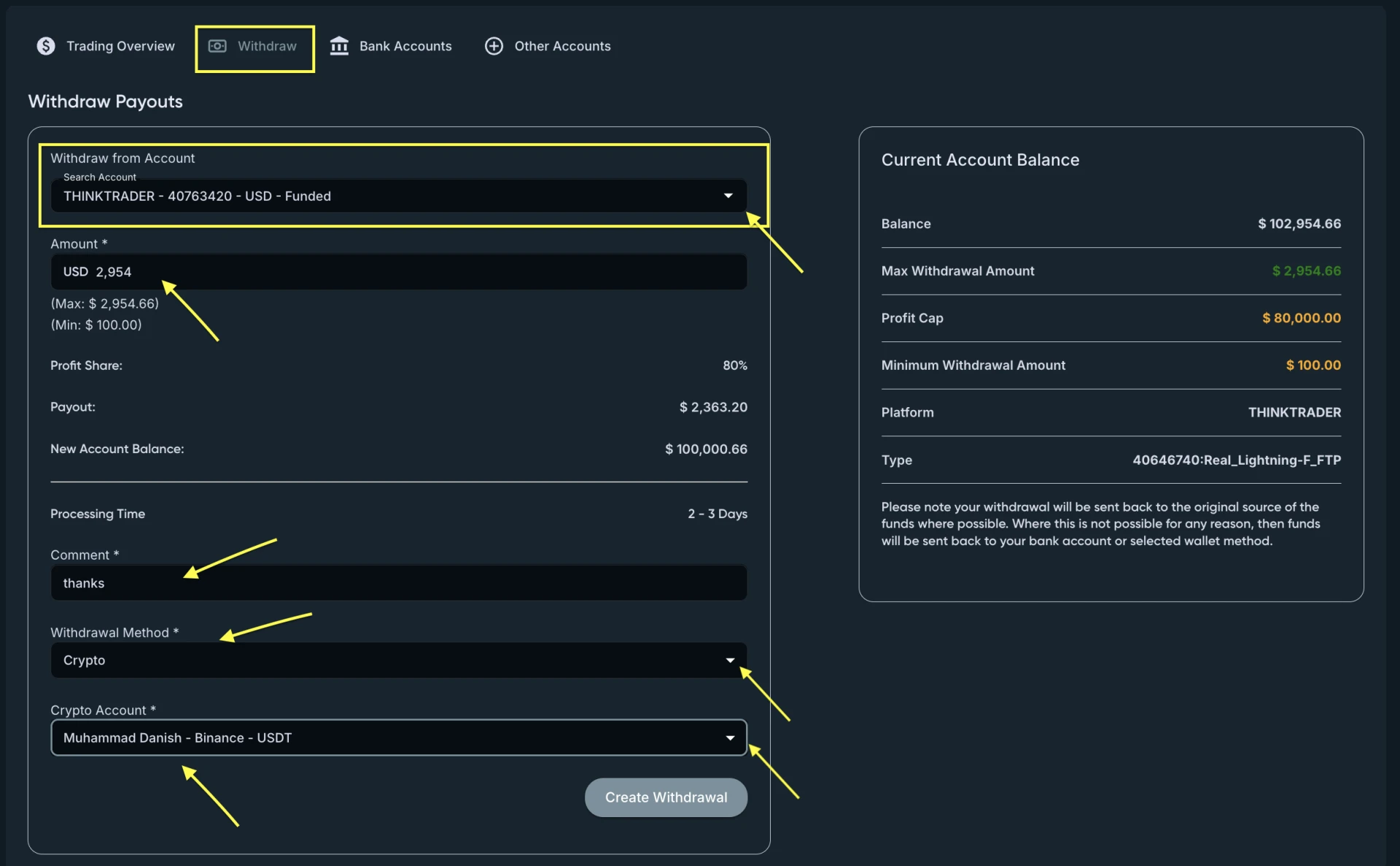 最后,从下拉菜单中选择您保存的加密货币账户,然后点击创建提现。