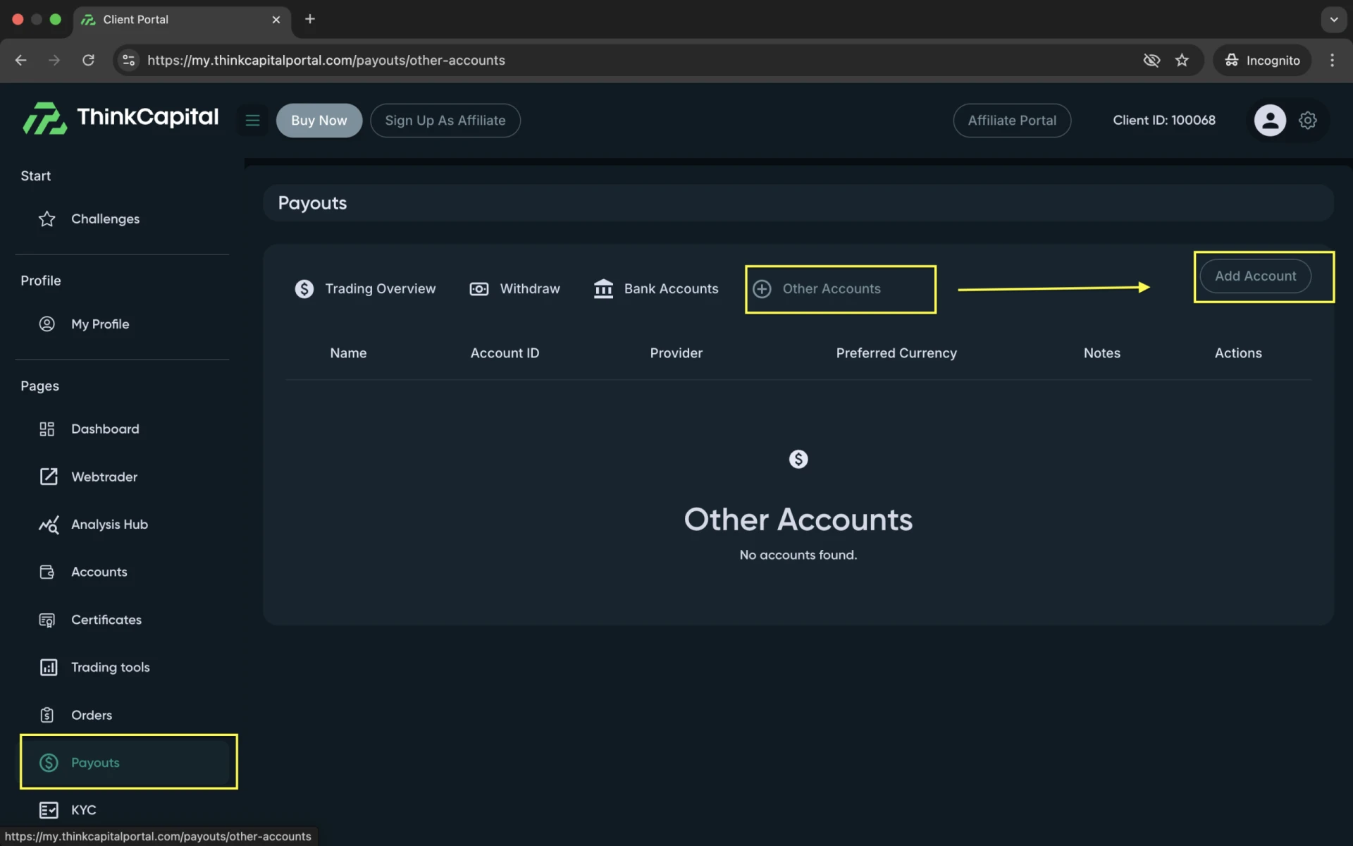 在此部分下,您将找到四个选项卡:交易概览、提取、银行账户和其他账户。