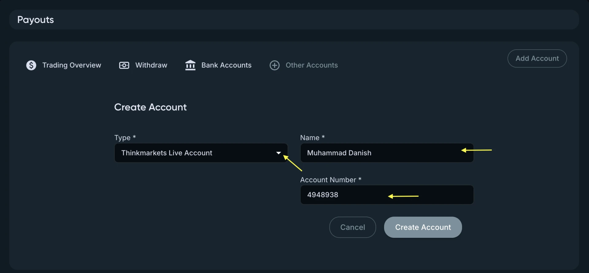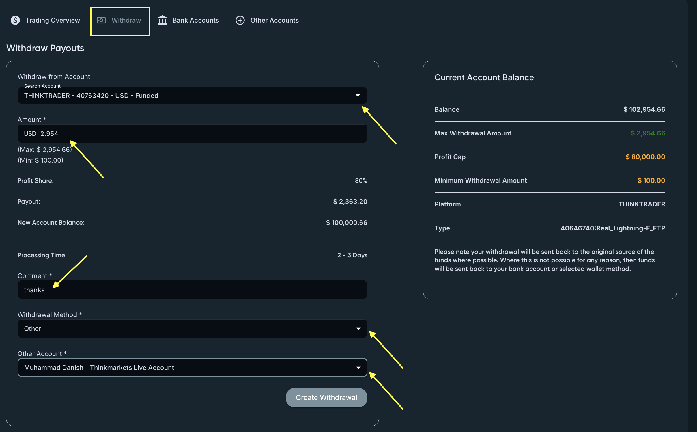 最後,從其他帳戶下拉選單中選擇您新增的 ThinkMarkets Live Account,然後點擊建立提款。