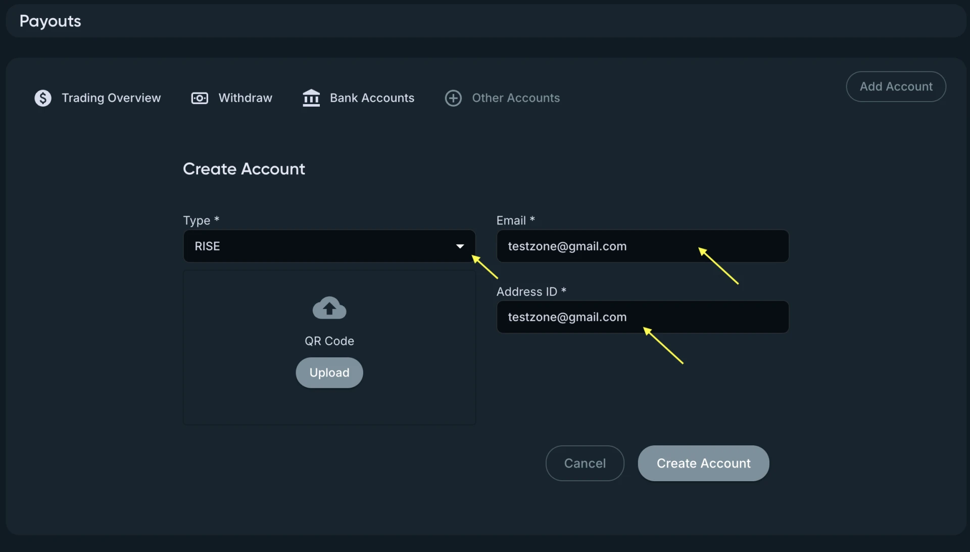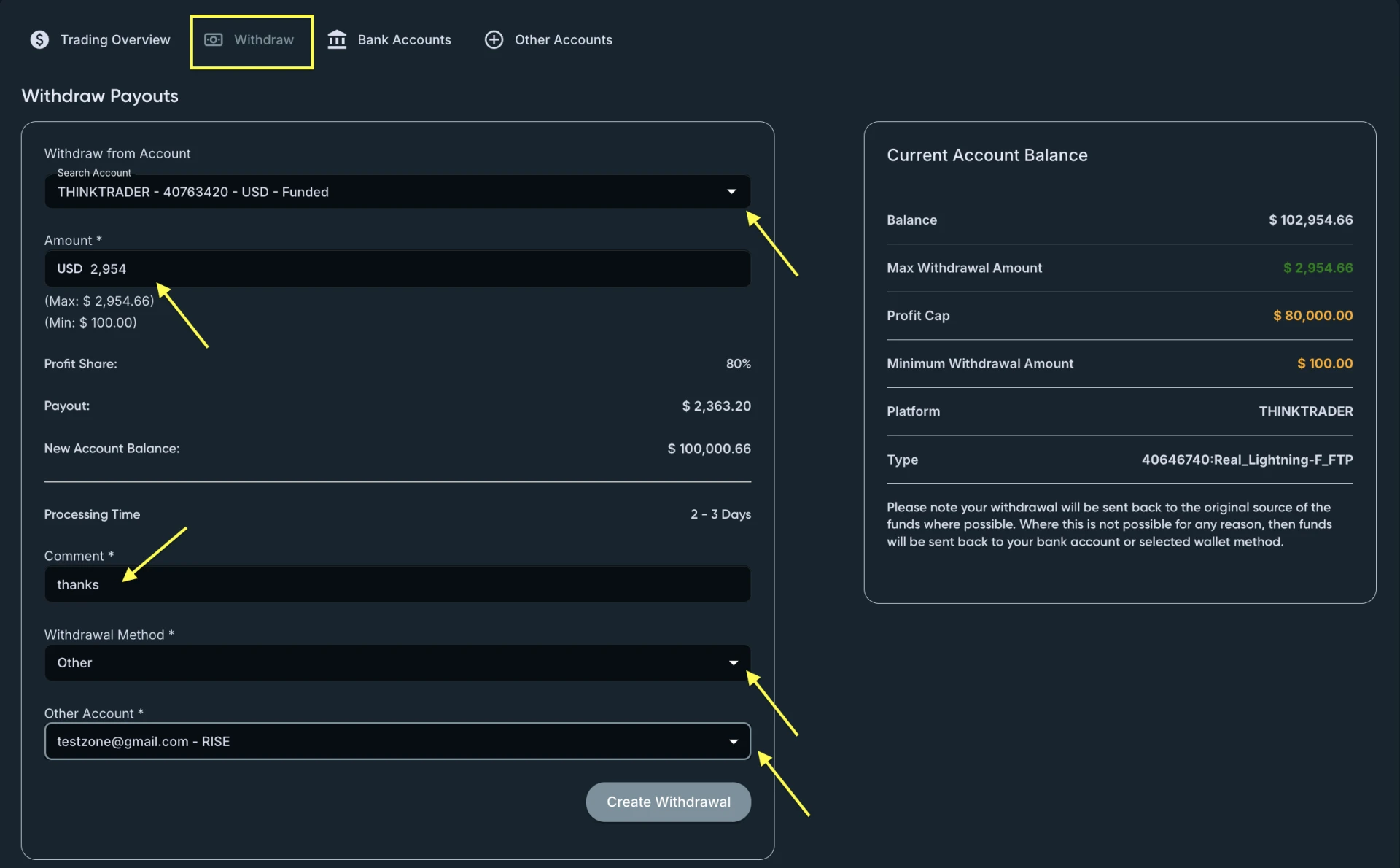 在最後一個欄位中,從下拉選單中選擇您最近新增的 Rise 帳戶,然後點擊建立提款。